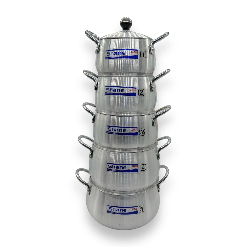 طقم قدور الألمنيوم الباكستاني المكون من 5 قطع متدرجة الحجم. هذه المجموعة المدمجة مثالية للمطابخ الصغيرة والمتوسطة، وتتميز بجودة التصنيع الباكستاني المعروف بمتانته.