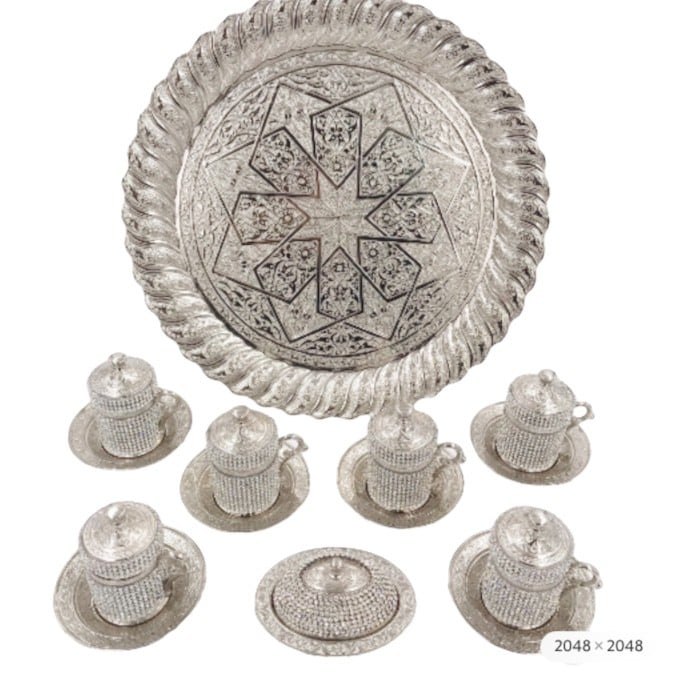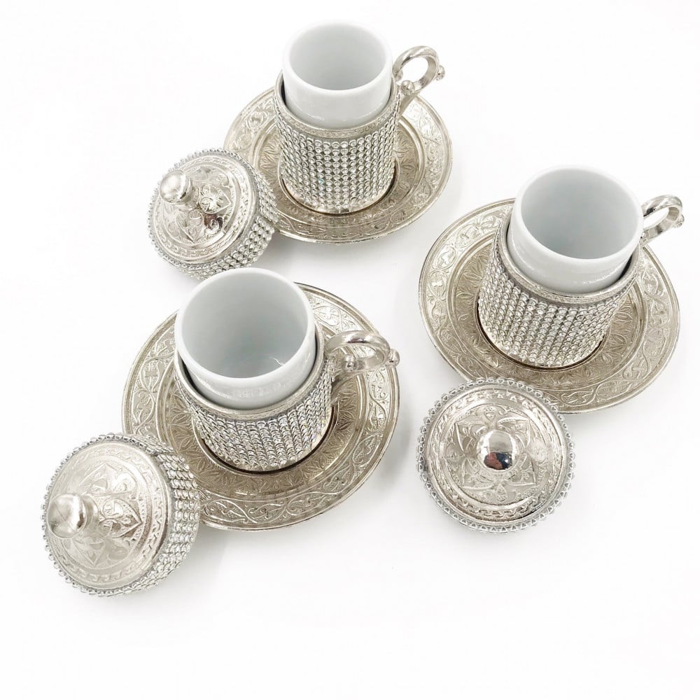 طقم فناجين قهوة تركي فاخر مكون من 6 قطع، مصمم بأسلوب تقليدي عريق يجمع بين الأناقة والتراث الشرقي. يتميز الطقم بلون فضي متألق ونقوش زخرفية دقيقة مستوحاة من الفن الإسلامي.